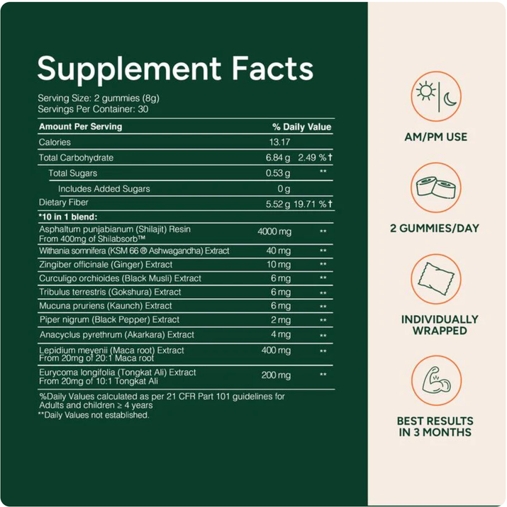 These gummies deliver a powerful blend of 3000 mg of Himalayan Shilajit, Ashwagandha, and Gokshura, promoting energy, immune support, and stress resilience. They help combat fatigue, enhance focus, and boost overall vitality, making them perfect for busy lifestyles.